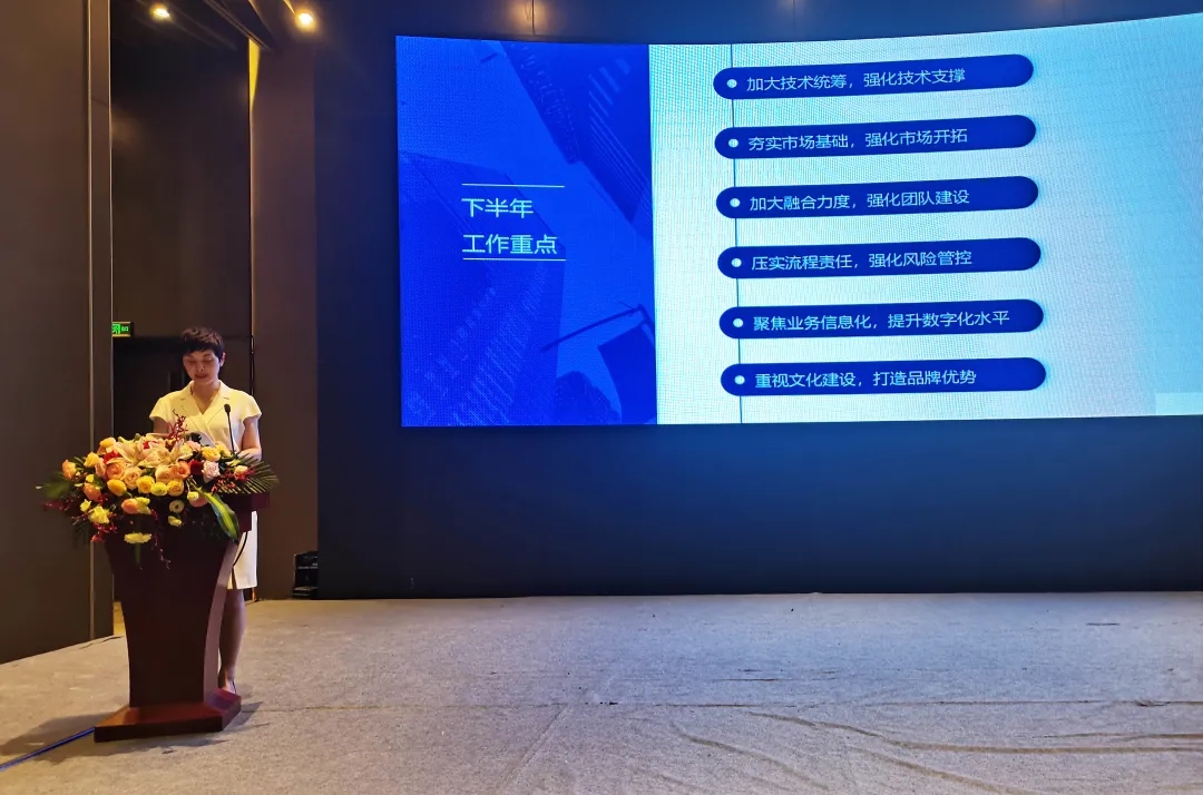 轮值总裁王琴就2021年上半年公司整体经营情况进行了分析,并对业务指标完成情况进行了通报,既肯定了大家在上半年的工作中的努力和成绩,也指出了存在的不足,围绕技术统筹、市场开拓、团队建设、风险防控、信息化建设、永业行等方面提出了新的要求和希望。她强调,围绕国家经济转型、创新驱动的大趋势,行业市场时刻在发生着新的变化,全体永业行人要凝心聚力,携手共进,继续深化改革、坚持创新发展,以更加强大的内动力,为永业行“三年行动计划”的落地开创新的局面。