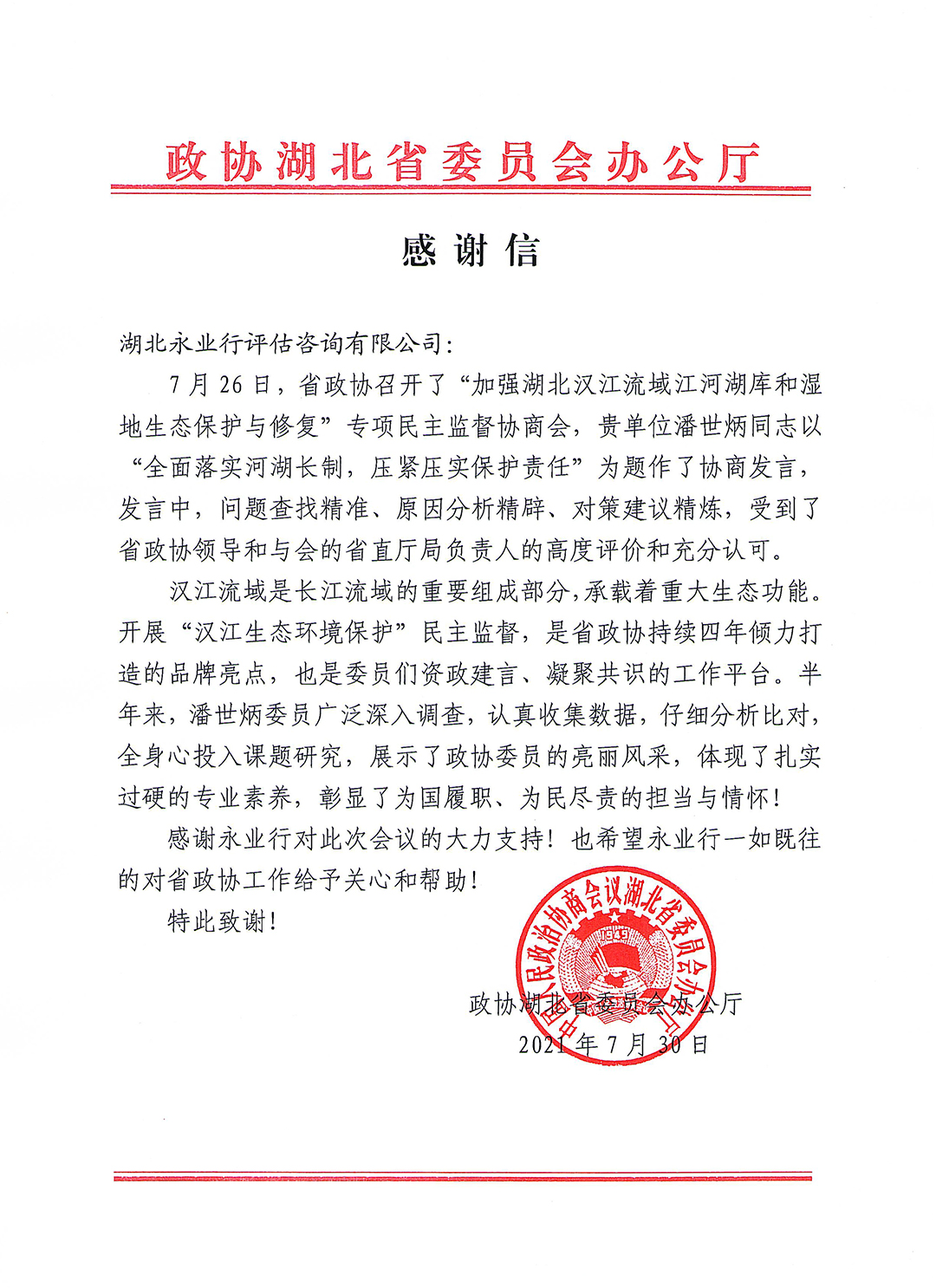 7月30日,政协湖北省委员会办公厅致函永业行,对省政协委员、永业行董事长潘世炳同志在省政协专项民主协商会上所作的“全面落实河湖长制,压紧压实保护责任”发言给予肯定和感谢,认为潘世炳同志在发言中,问题查找精准、原因分析精辟、对策建议精炼,受到了省政协领导和与会的省直厅局负责人的高度评价和充分认可。