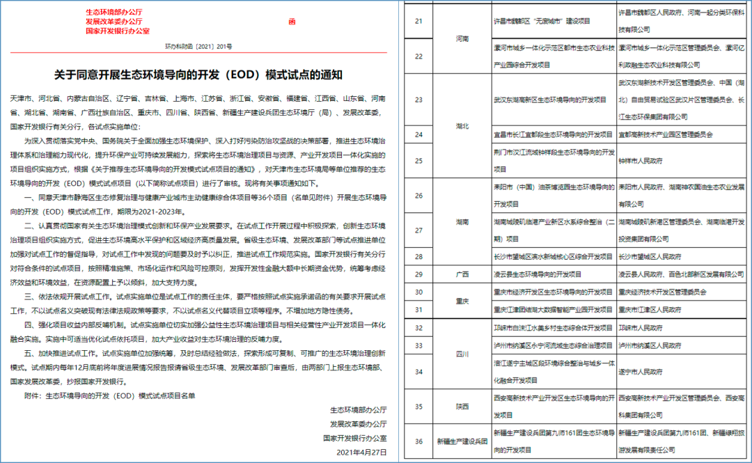 2021年4月公布了我国第一批36个开展EOD模式试点工作的项目,期限2021-2023年。其中永业行参与的三个项目成功入选。