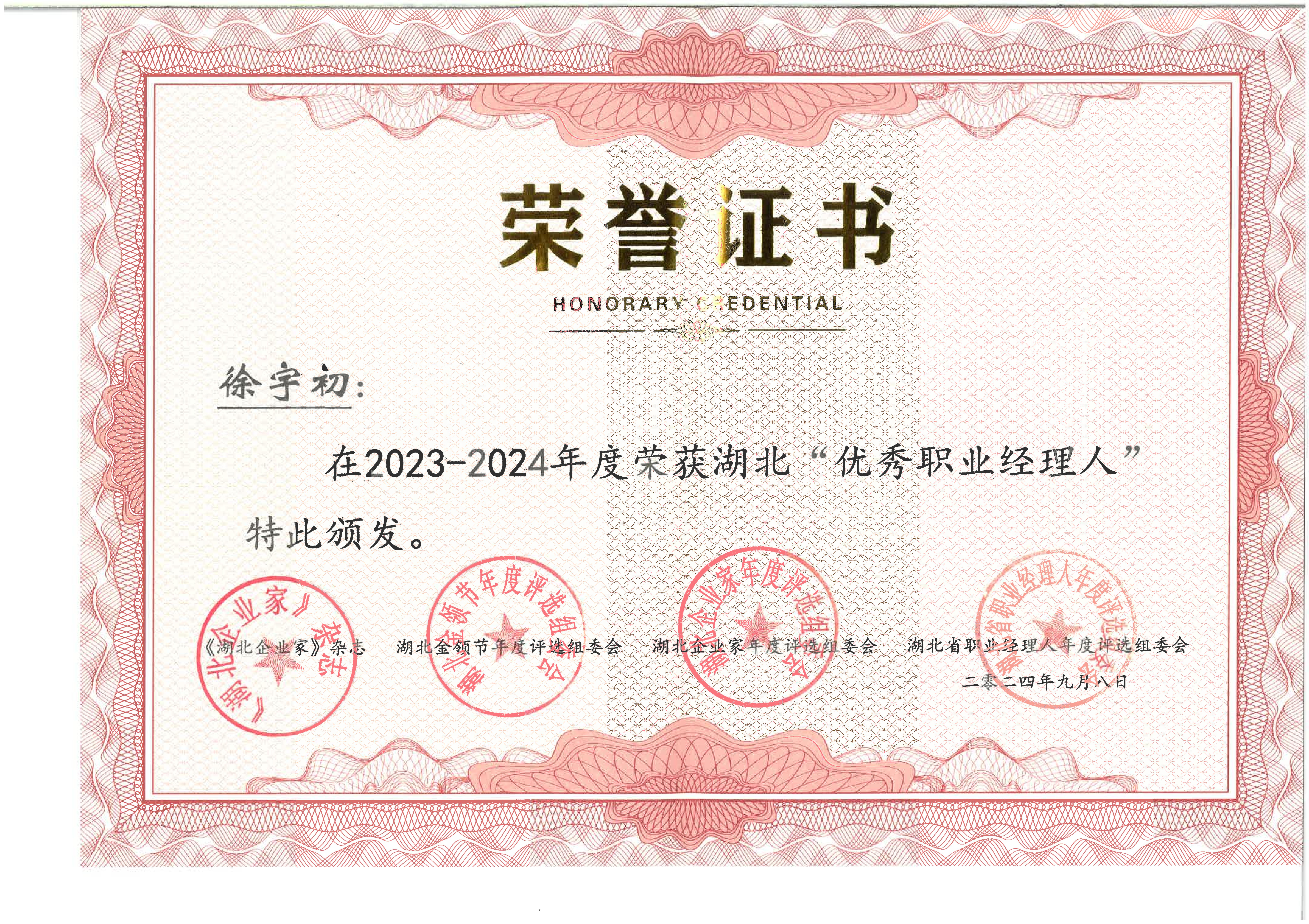 徐宇初荣获2023-2024年度湖北“优秀职业经理人
