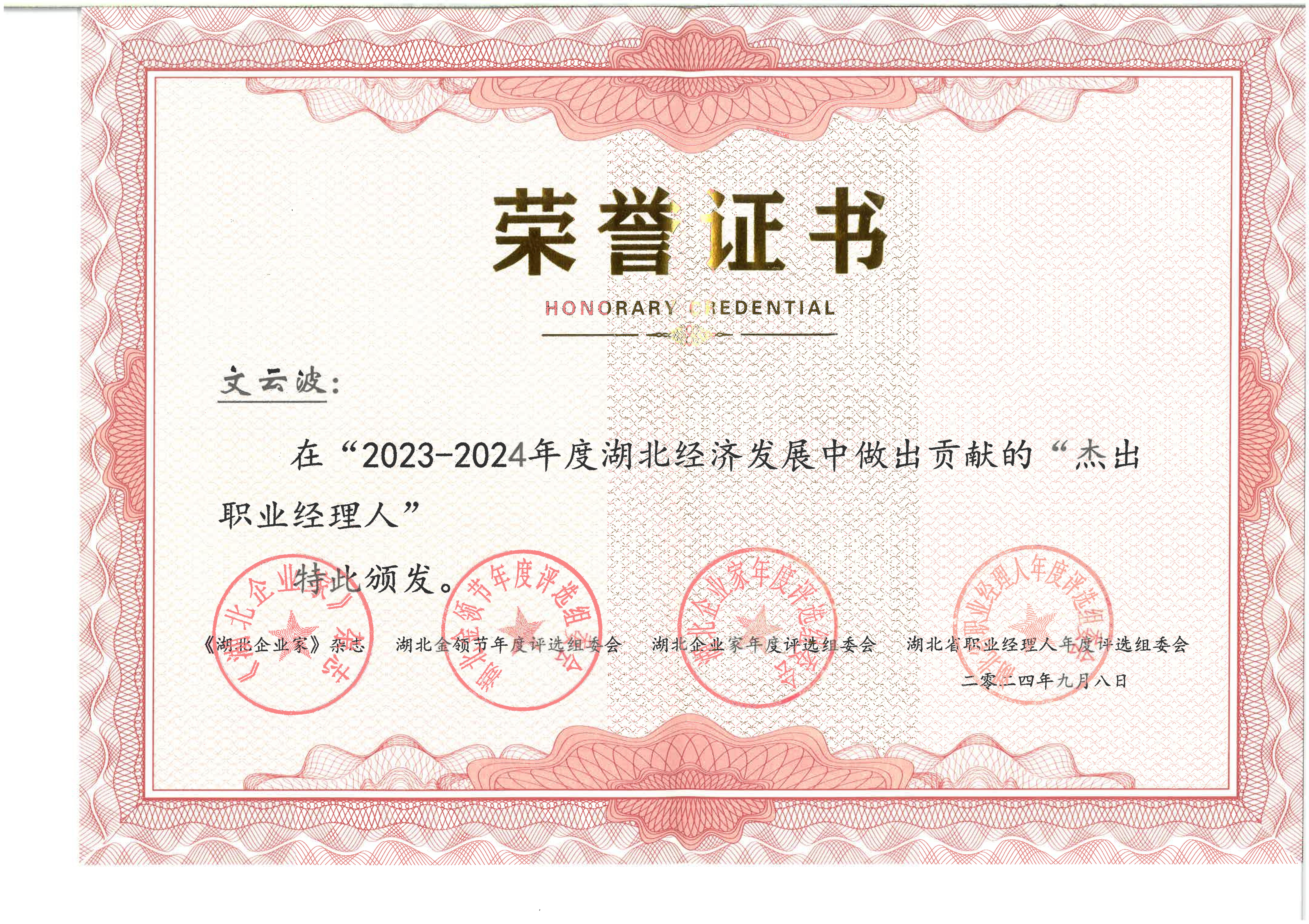 文云波荣获2023-2024年度湖北经济发展中做出贡献的“杰出职业经理人”