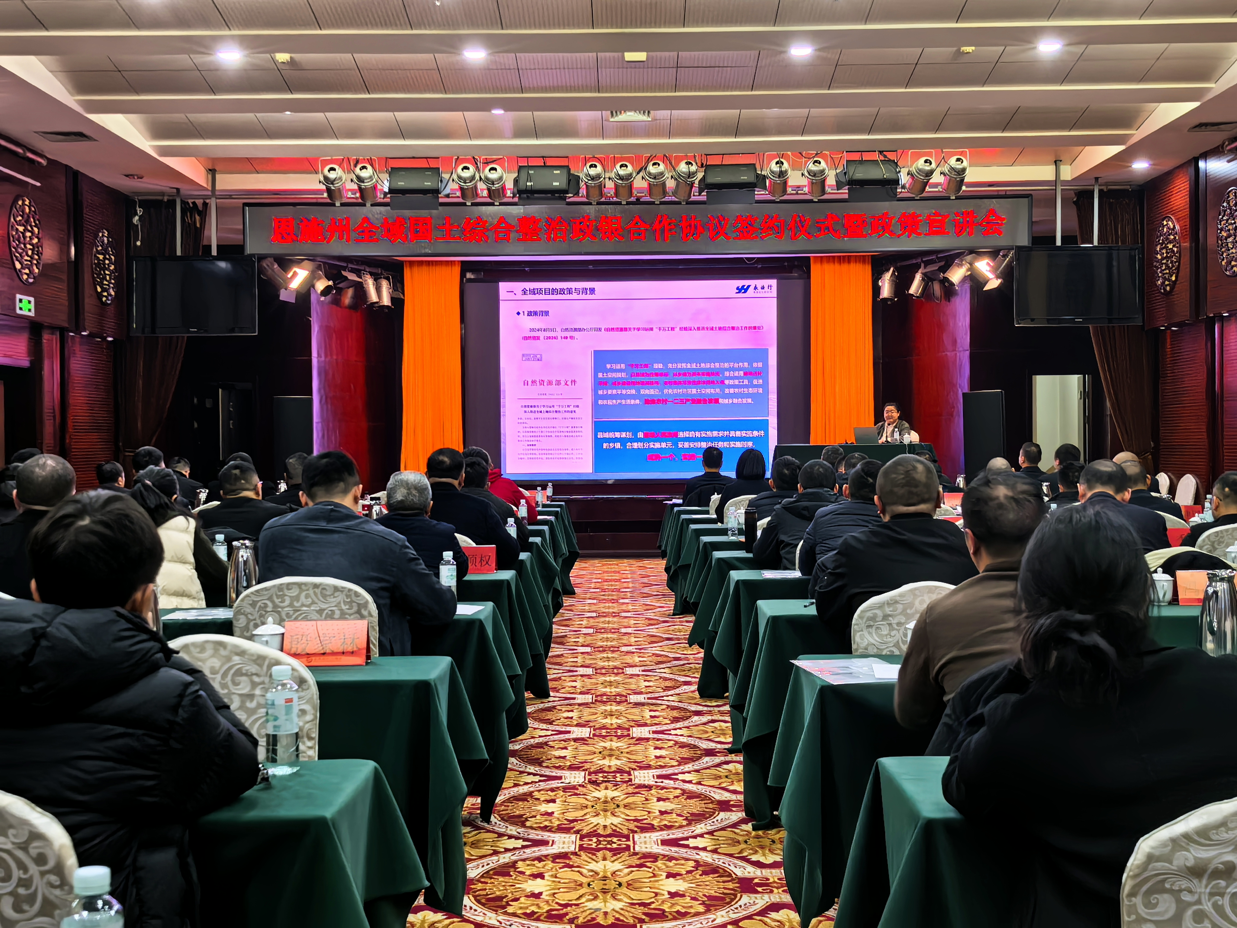 2025年3月18日,恩施州自然资源和城乡建设局、中国农业发展银行恩施州分行联合举行“恩施州全域国土综合整治政银合作协议签约仪式暨政策宣讲会”。恩施州资建局党组书记、局长邓亚敏,中国农业发展银行恩施州分行行长、党委书记余利发出席会议,恩施州国土整治局局长徐欣主持会议。永业行副总裁兼鄂西区总经理雷小明带领技术团队参加会议,鄂西区国土整治技术副总监黄兴华作“全域国土综合整治实施方案编制实操”主题分享交流。