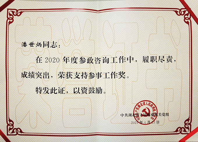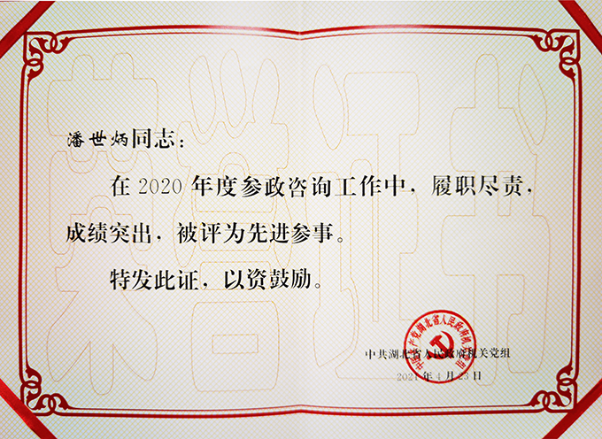 近日,中共湖北省人民政府机关党组发文,对2020年度先进参事和参事工作单项奖获奖参事进行通报,省政府参事、永业行董事长潘世炳荣获先进参事、参政建议一等奖、支持参事工作奖等多项荣誉。