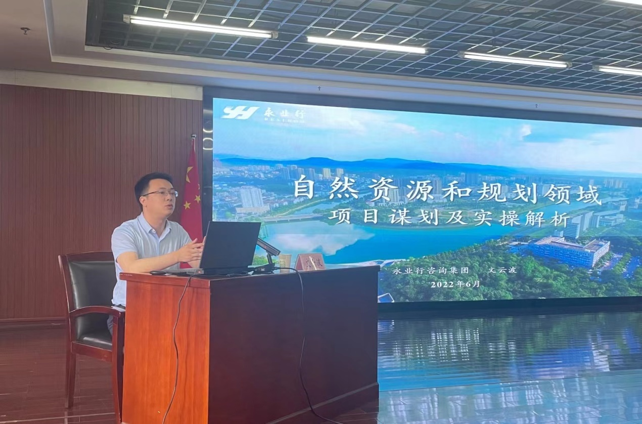 2022年6月17日,咸宁市自然资源和规划局举办全市自然资源和规划系统“第3期干部学习大讲堂”。永业行副总裁文云波受邀作自然资源和规划领域项目谋划及实操解析专题培训。咸宁市自然资源和规划局党组成员、副局长石健主持会议。
