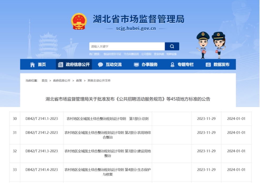 近日,湖北省市场监督管理局发布45项地方标准的公告,永业行参编的《农村地区全域国土综合整治规划设计导则 第2部分:农用地综合整治》(标准号:DB42/T 2141.2-2023)、《农村地区全域国土综合整治规划设计导则 第4部分:生态保护与修复》(标准号:DB42/T 2141.4-2023)批准发布。