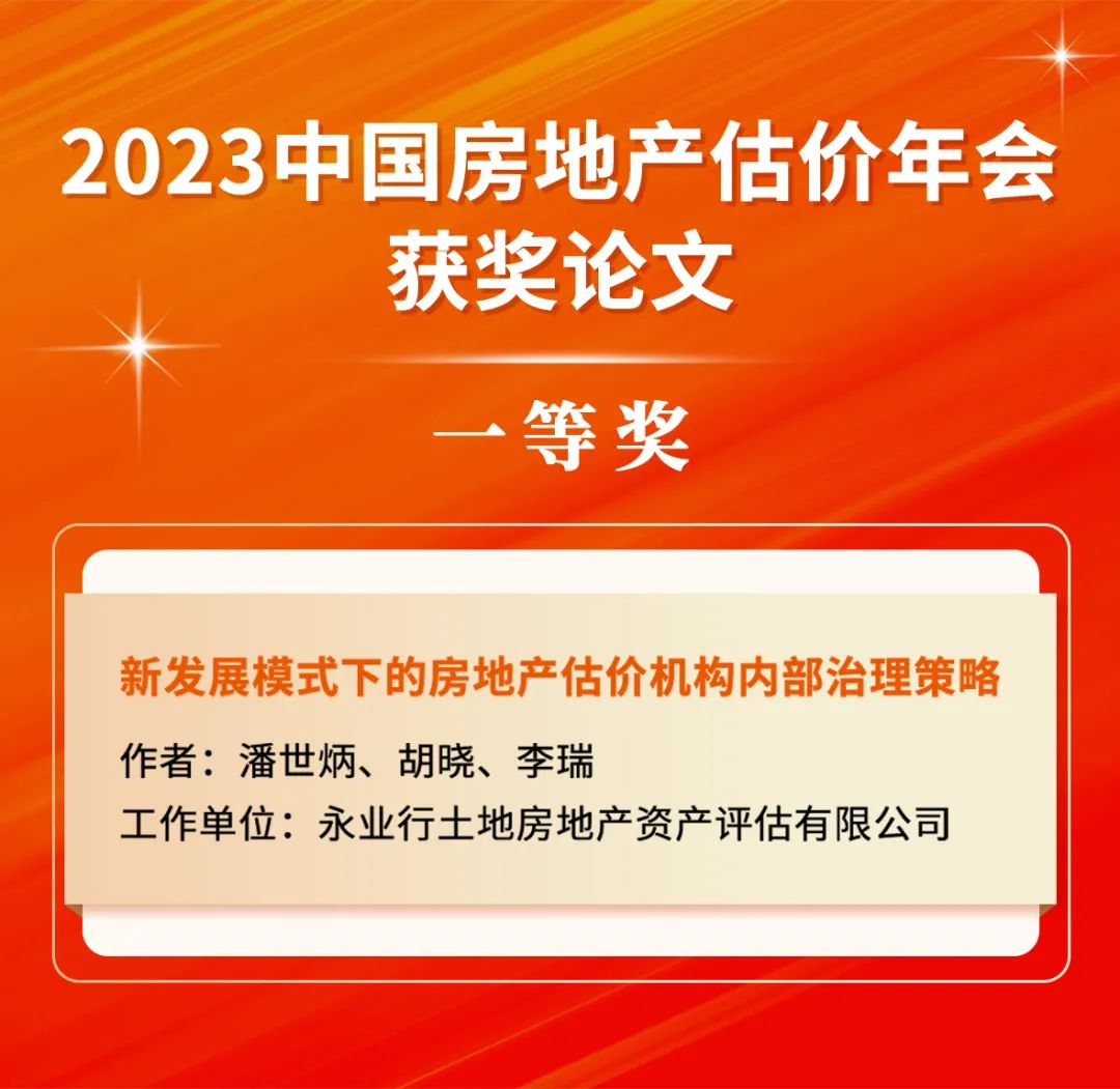 近日,中国房地产估价师与房地产经纪人学会“加强内部治理、推动高质量发展”2023中国房地产估价年会论文征集评选揭晓。永业行董事长潘世炳等撰写的《新发展模式下的房地产估价机构内部治理策略》获评一等奖,公司投稿的10篇论文均入选年度论文集。